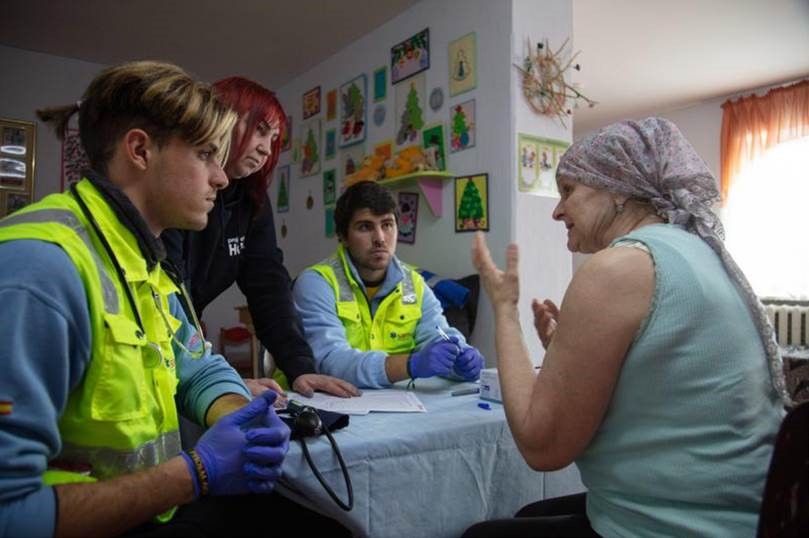 Left Photo: Inga, a Project HOPE translator, works with SAMU team members to perform a health assessment of Galina, a 62-year-old Ukrainian refugee living at the Bulboaca Refugee Settlement in Moldova.